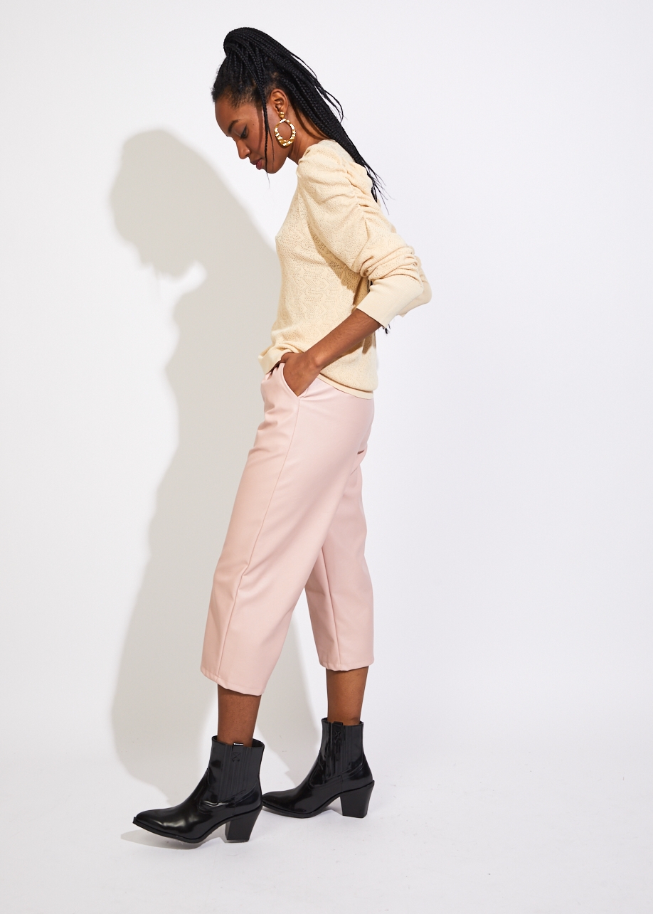 Camisola de malha jacquard com decote redondo e manga comprida franzida e abalonada no ombro.